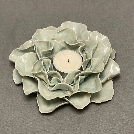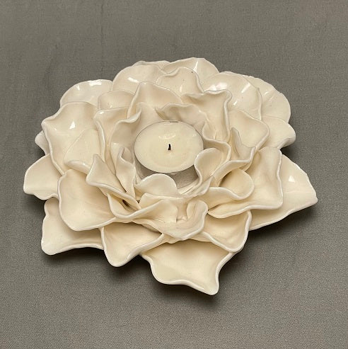 Create a soothing ambience with the elegant design of the Tealight Candle Flower. Perfect for adding a touch of sophistication to any room. Hand-built porcelain flower, medium fired and available in an off-white and green glaze finish, meant to hold a single tealight (not included).