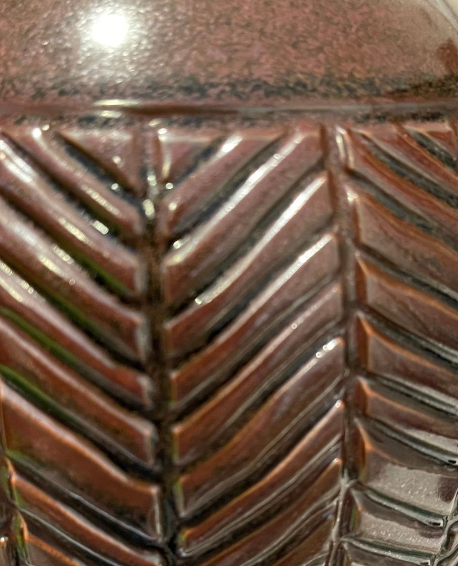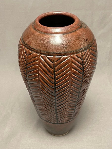 Enhance your space with this large vase featuring an exquisite incised chevron pattern. Handcrafted to perfection, this elegant decor piece adds a touch of sophistication to any room. A versatile choice for showcasing fresh blooms or standing alone as a statement piece. Thrown porcelain vase with incised chevron pattern, high fired to Cone 10 with Tenmoku glaze.