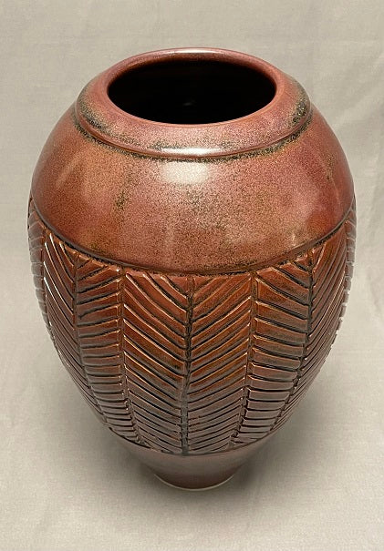 Enhance your space with this large vase featuring an exquisite incised chevron pattern. Handcrafted to perfection, this elegant decor piece adds a touch of sophistication to any room. A versatile choice for showcasing fresh blooms or standing alone as a statement piece. Thrown porcelain vase with incised chevron pattern, high fired to Cone 10 with Tenmoku glaze.