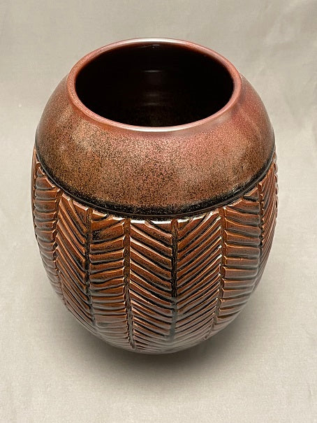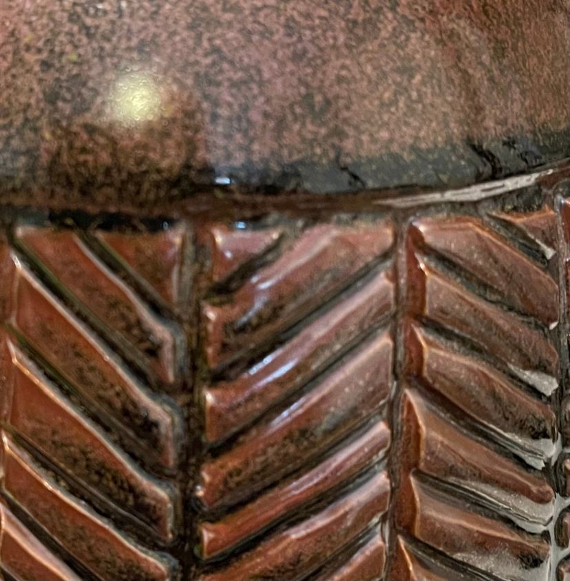 Enhance your space with this large vase featuring an exquisite incised chevron pattern. Handcrafted to perfection, this elegant decor piece adds a touch of sophistication to any room. A versatile choice for showcasing fresh blooms or standing alone as a statement piece. Thrown porcelain vase with incised chevron pattern, high fired to Cone 10 with Tenmoku glaze.