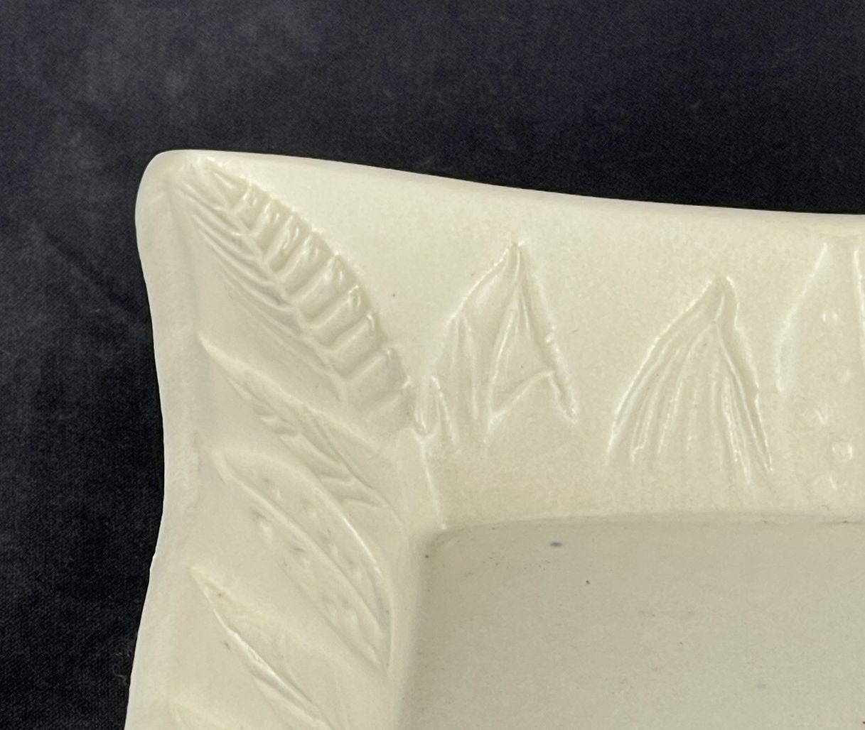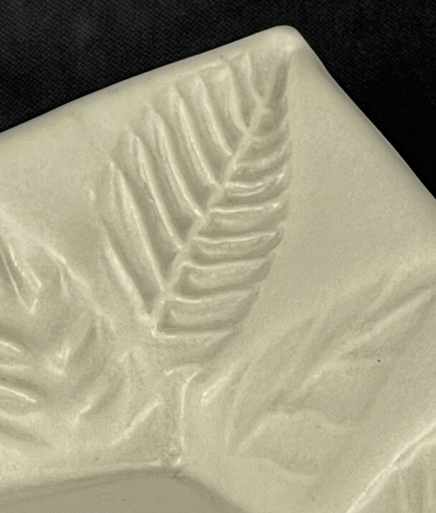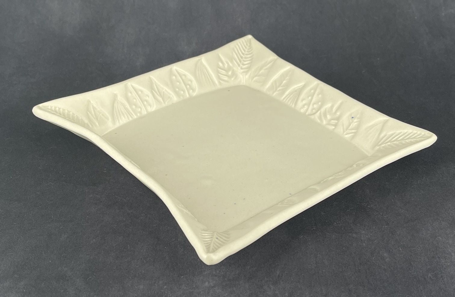 Medium size square Porcelain Plate with raised edges and Embossed Leaves Border. Medium fired to Cone 6 with a matte white glaze finish.