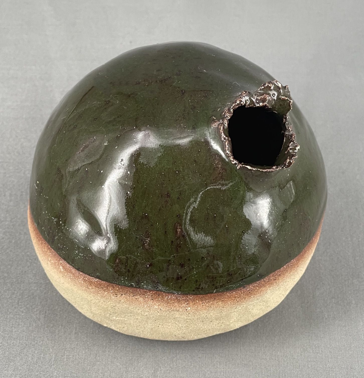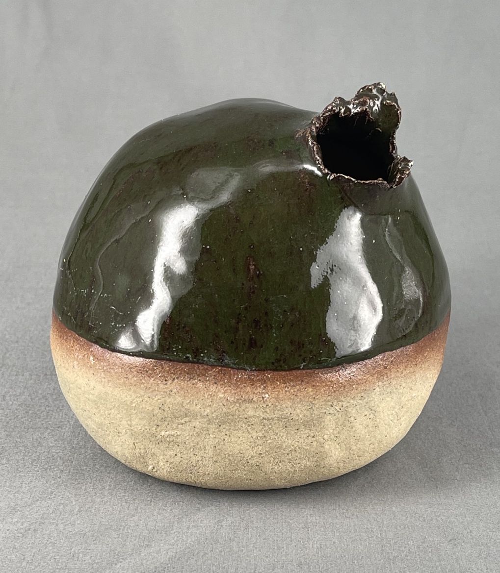 Small “Explosion” Vase with dark green finish over unglazed base. Medium fired.