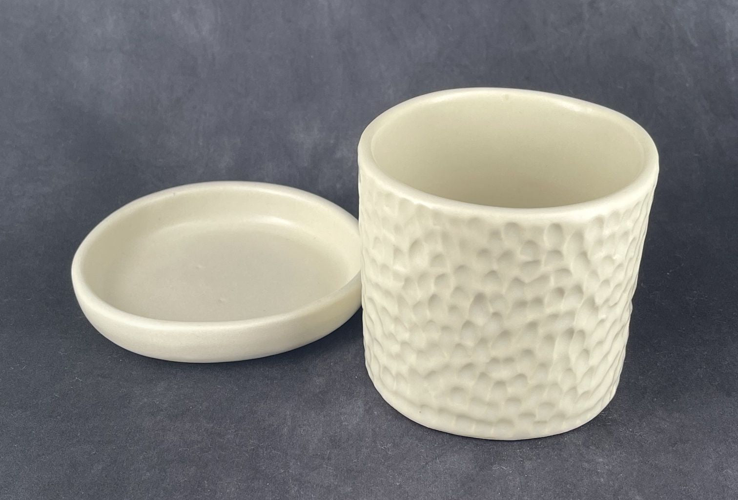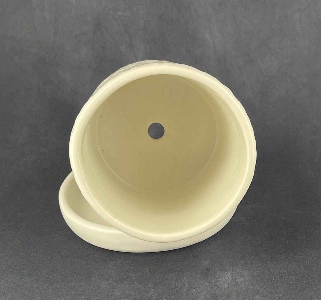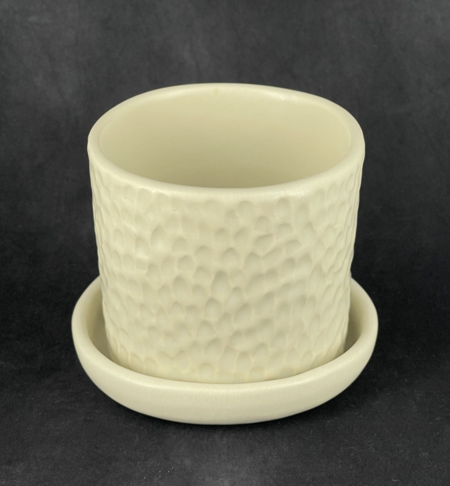 Small Porcelain Planter with Drip Tray in a gouged finish, medium fired to Cone 6 with a matte white glaze finish, approximately 12 cm diameter