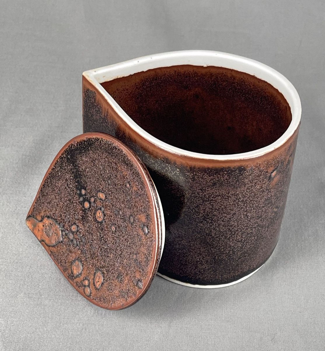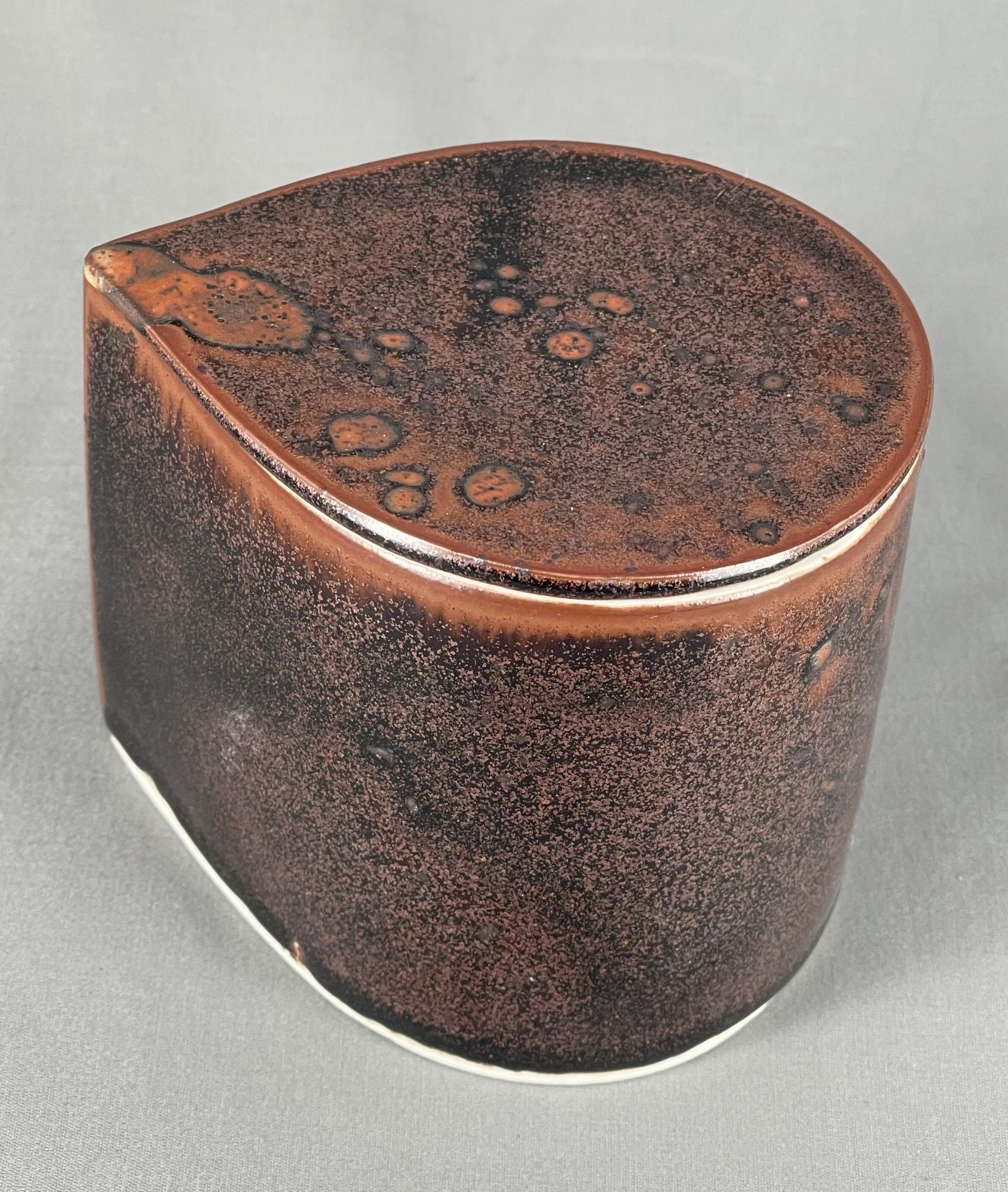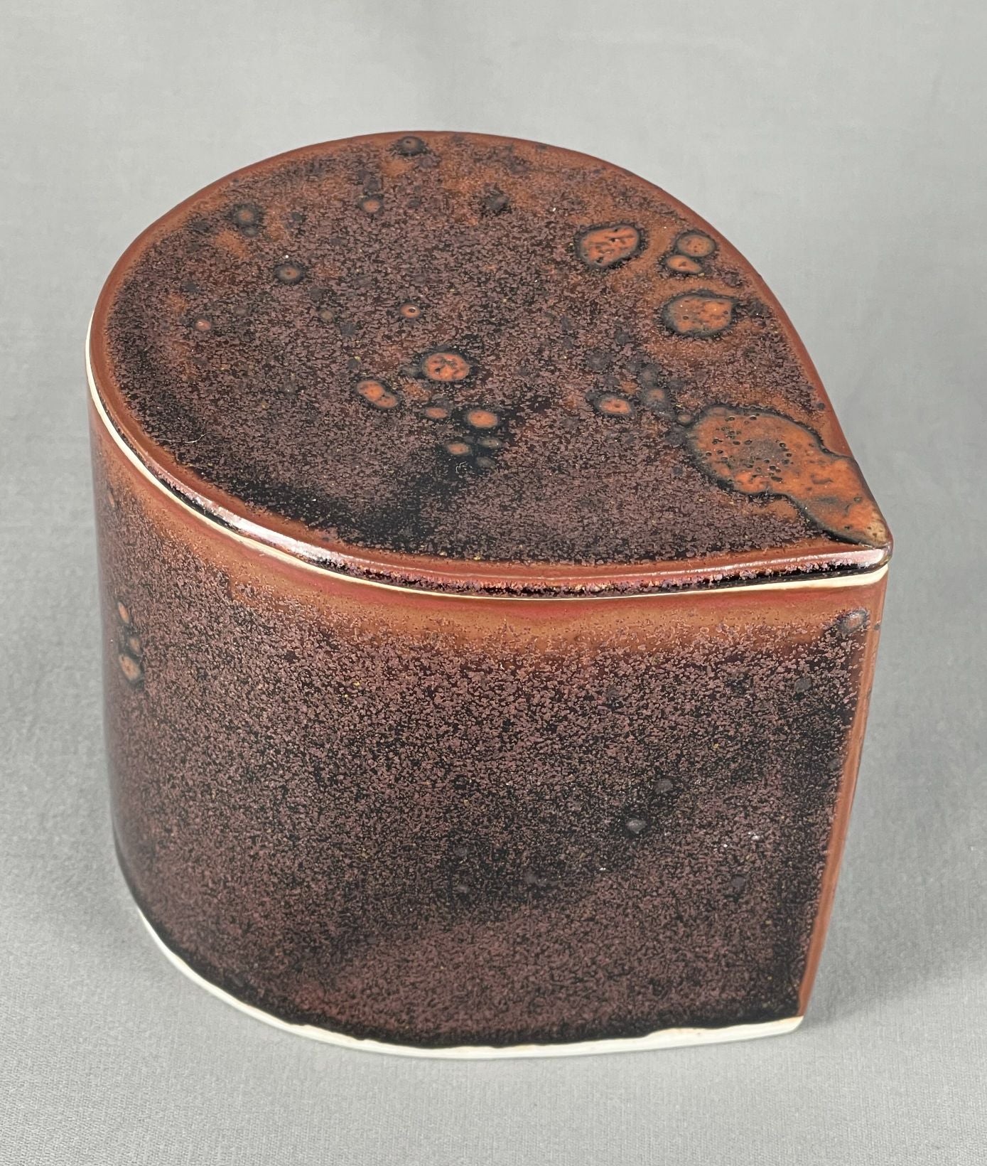 Small porcelain teardrop shaped Lidded Vessel, high fired to Cone 10 in reduction with Tenmoku glaze. Approximately 10 cm (4 in) diameter.